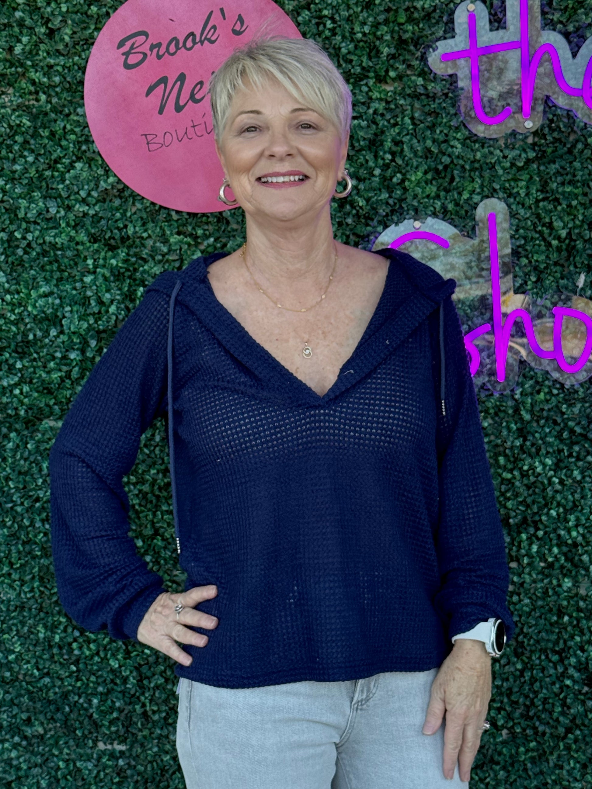 Stay cozy and stylish in our Navy Knit Hoodie. This waffle knit top features a hood and drawstrings, making it perfect for any season. Embrace comfort and fashion with this must-have piece!