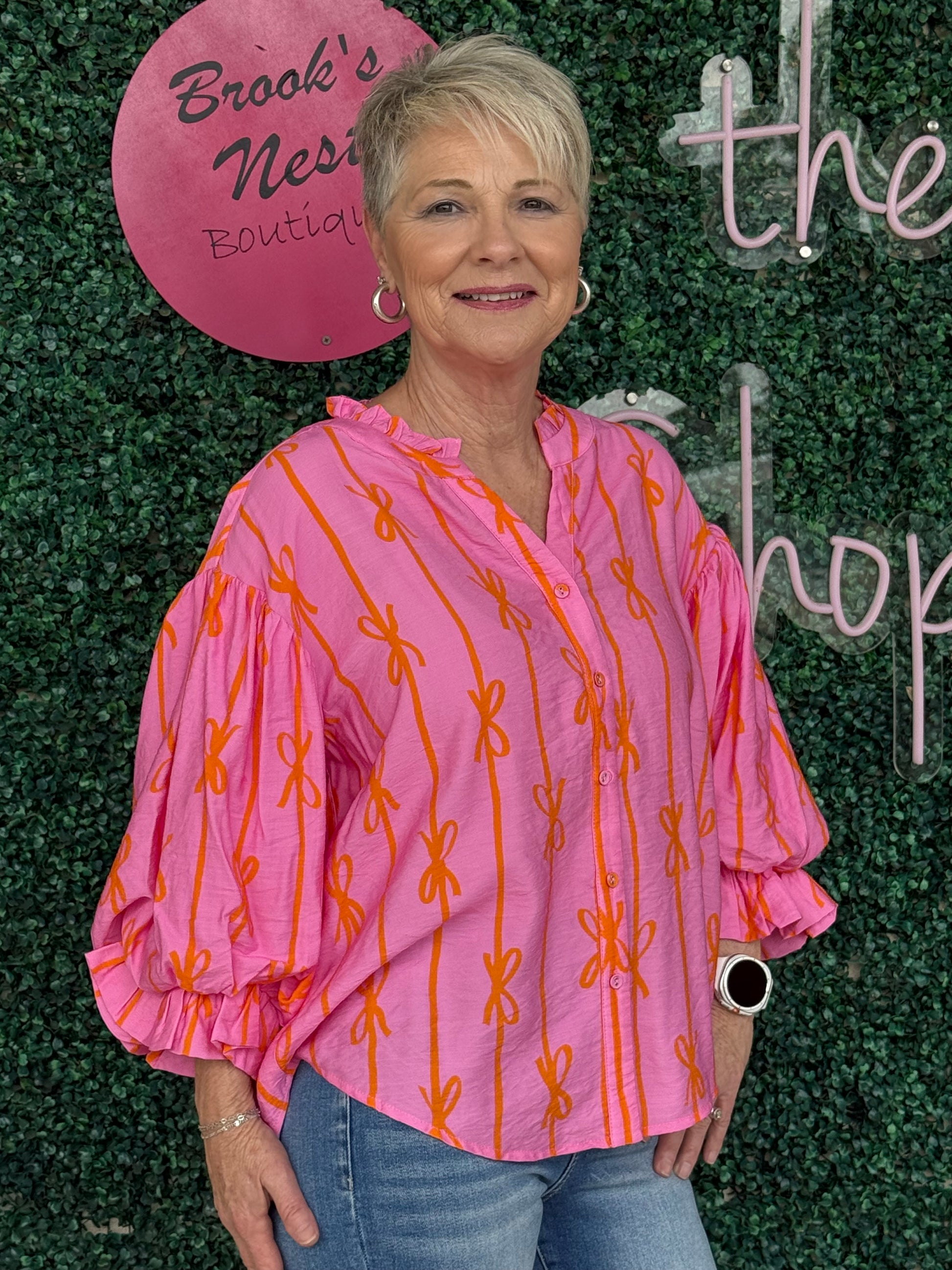 Indulge in the playful and feminine charm of our Ribbon Bubble Sleeve Top! Featuring a delightful bow ribbon print, this woven top exudes whimsy and style. The statement bubble sleeves and button down closure add a touch of elegance. A must-have for any fashion-forward wardrobe!
