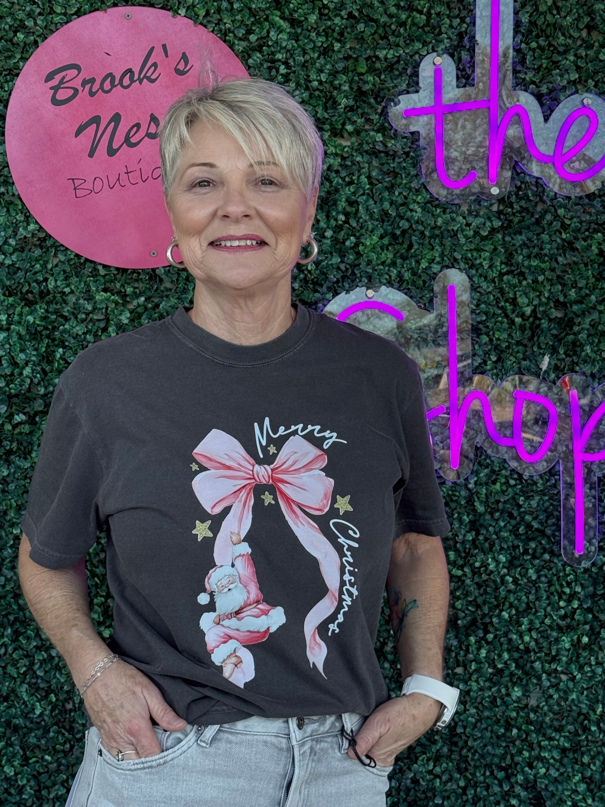 Unleash the holiday spirit with our Santa on Bow Tee! This graphic t-shirt features Santa himself riding a bow, adding a playful touch to your wardrobe. Don't miss out on this festive masterpiece!