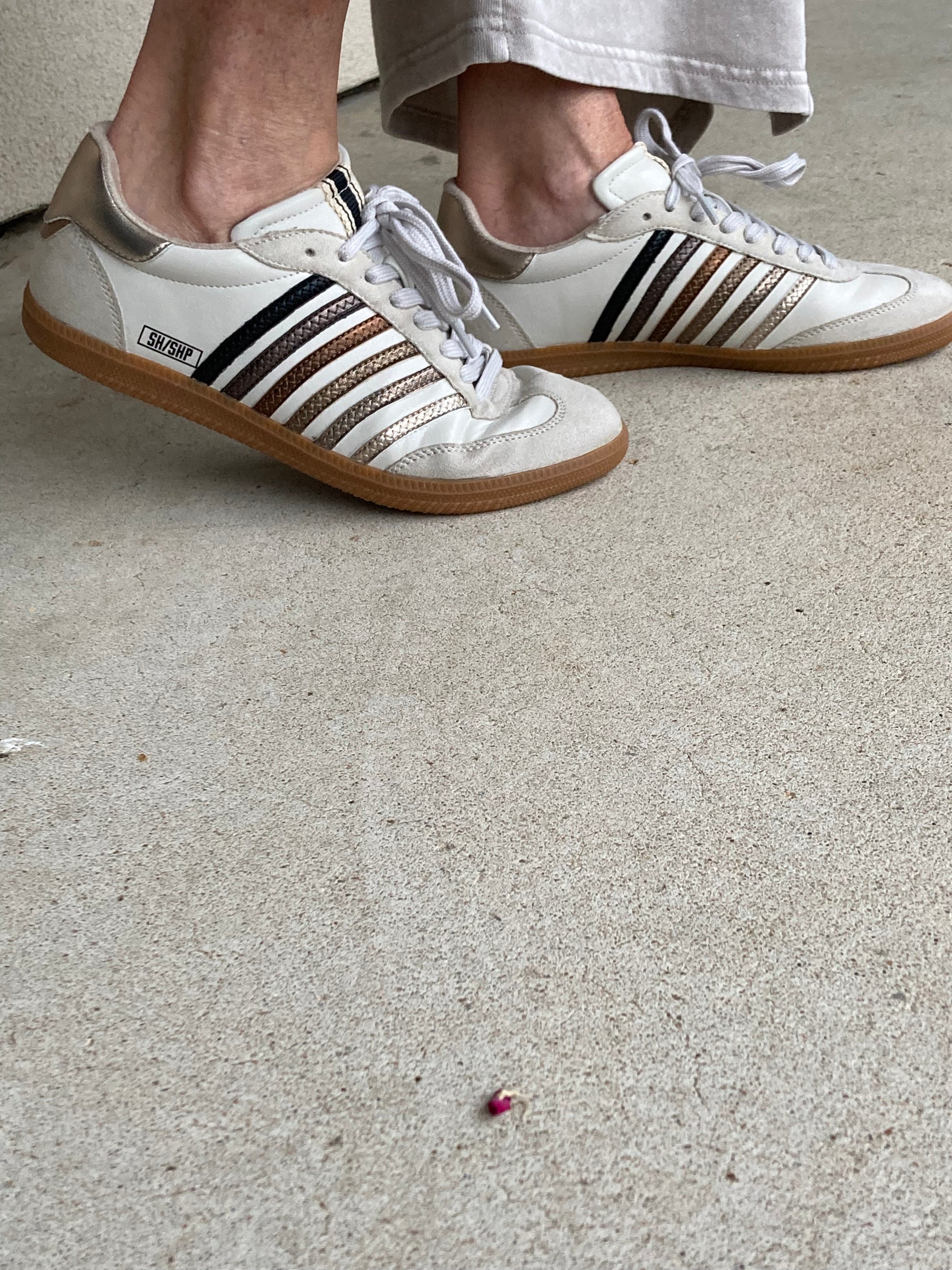 This Retro-inspired sneaker redefines cool, featuring bold-to-soft metallic stripes and a matching heel accent. Crafted from luxe faux leather and suede and finished with a gun sole, it's the perfect mix of style and comfort.