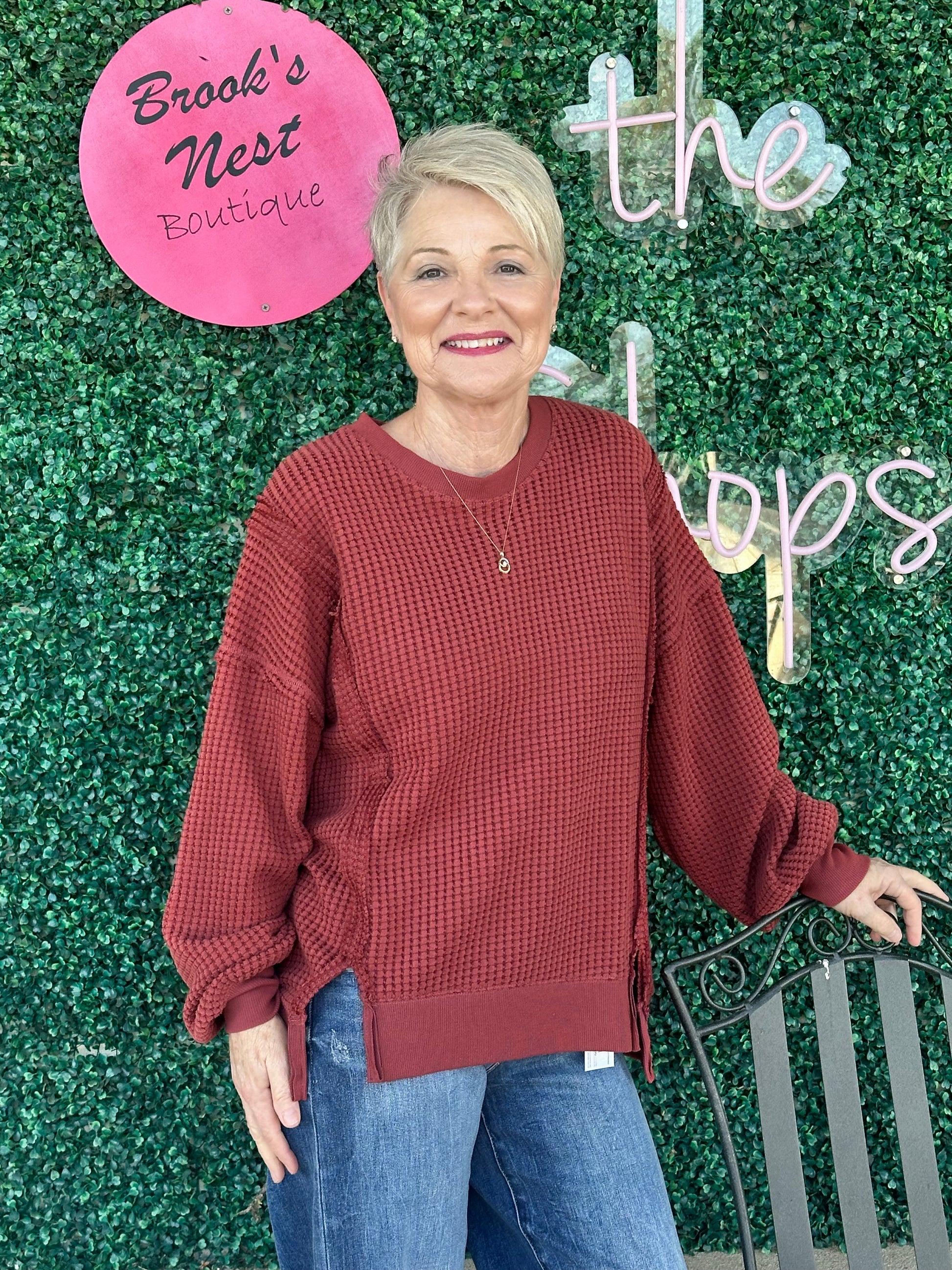 Indulge in comfort and style with the Burgundy Waffle Knit Top. This oversized casual top is made of high quality waffle knit fabric, providing both warmth and breathability. Its loose fit allows for effortless movement, making it perfect for casual days out or cozy nights in. Upgrade your wardrobe with this must-have piece!