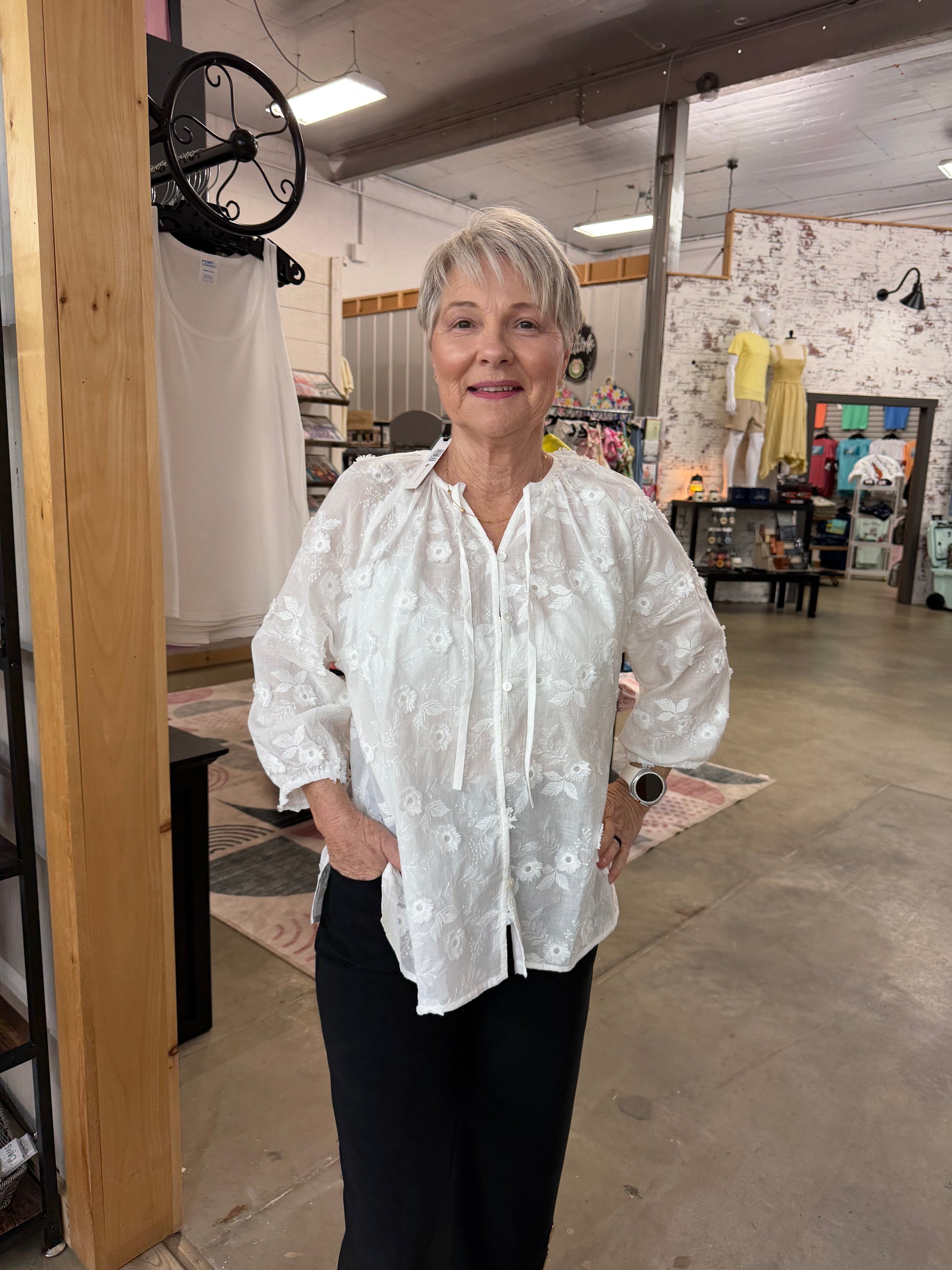 The Esther Top features an embroidered floral design with a button front closure, combining elegance with functionality. This garment is crafted to provide a polished appearance while allowing ease of wear, making it suitable for both casual and formal settings. The intricate embroidery enhances the visual appeal, ensuring a sophisticated look.