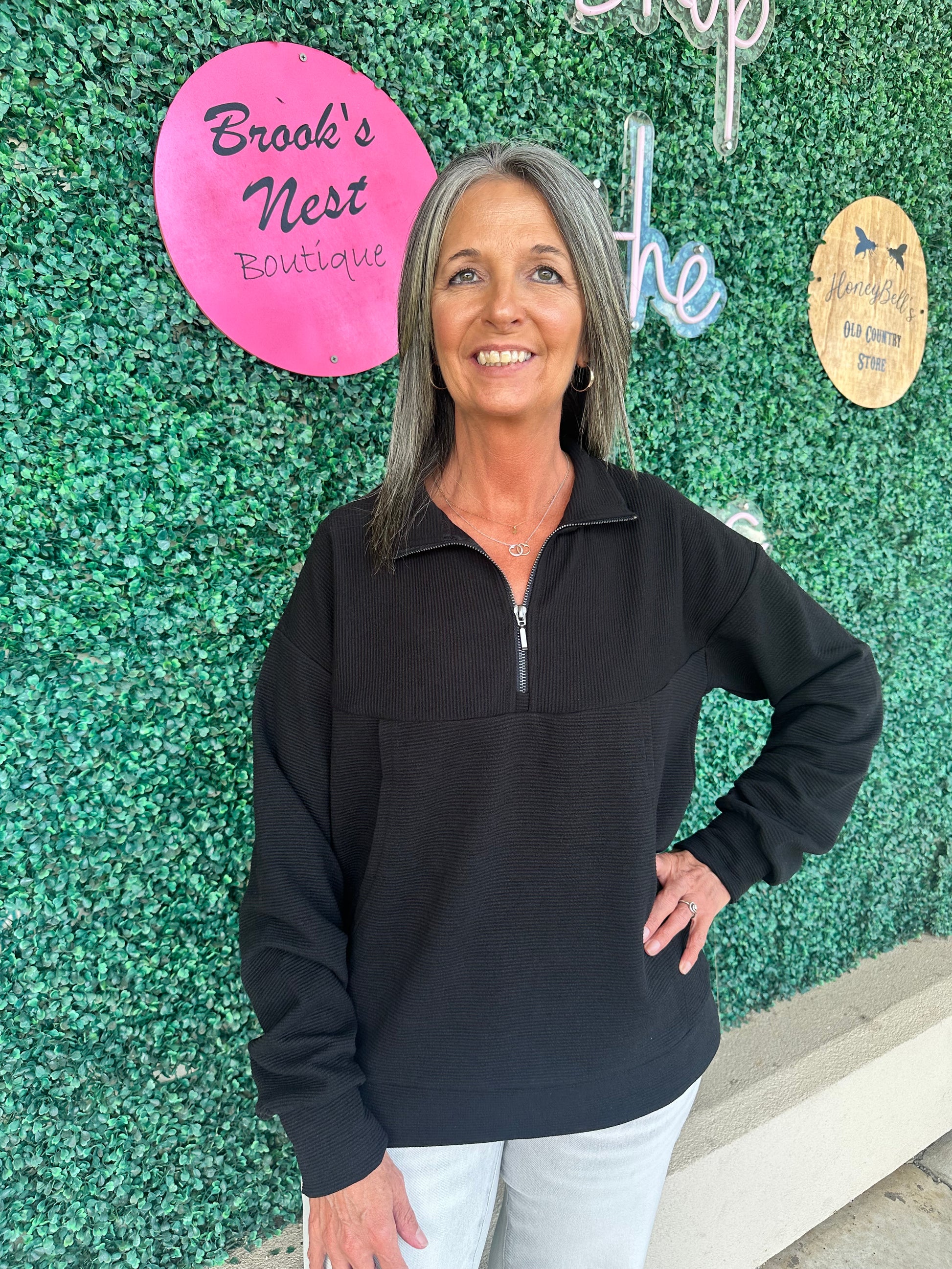 The Lyla Top is expertly designed for both style and convenience. Featuring a half zip design and side pockets, this top offers effortless on-the-go access while maintaining a polished look.