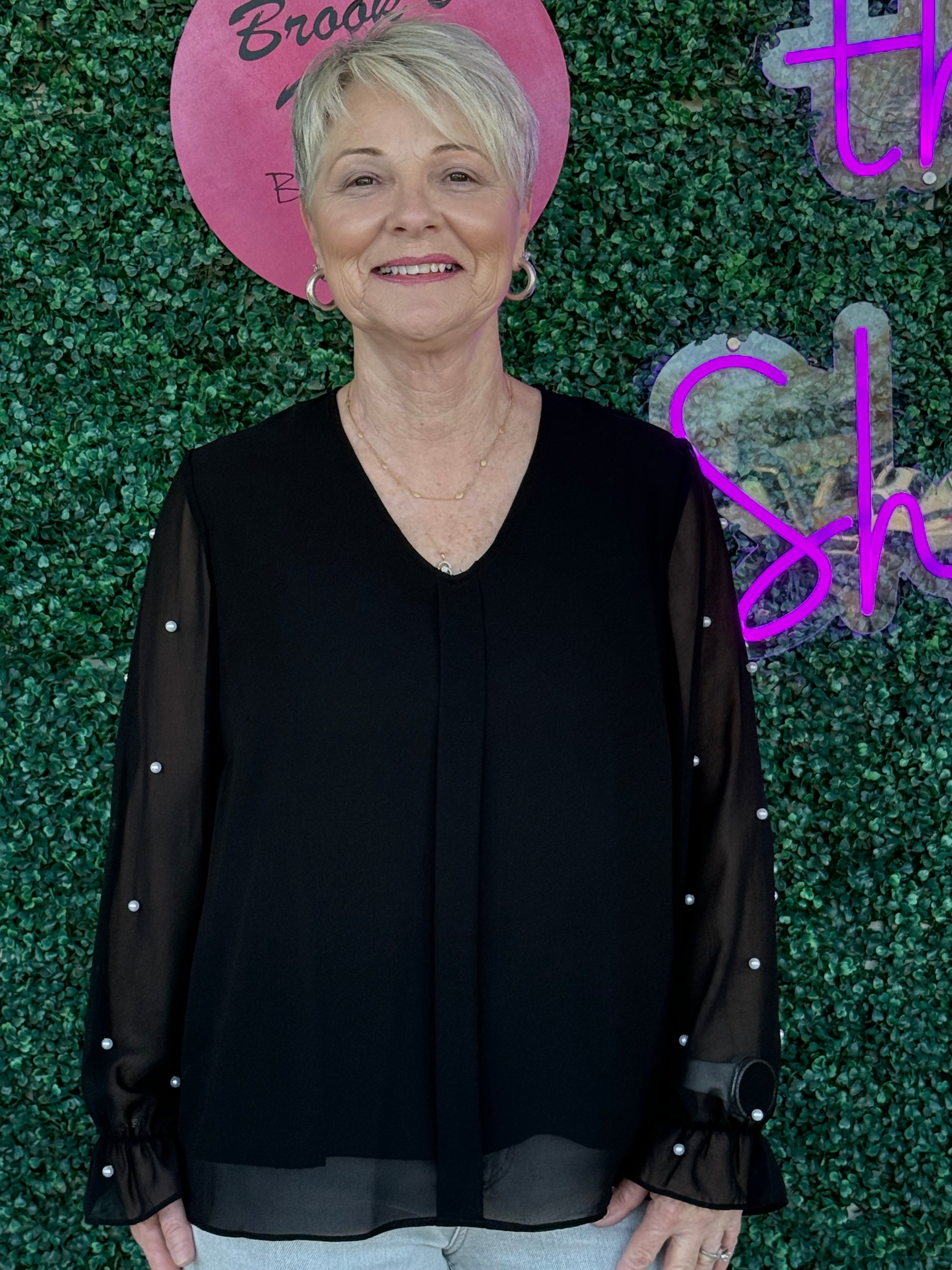 This stunning black blouse is elevated with sheer long sleeves adorned with delicate pearls, creating a unique and elegant look. Add a touch of sophistication to your wardrobe with The Perla Top.