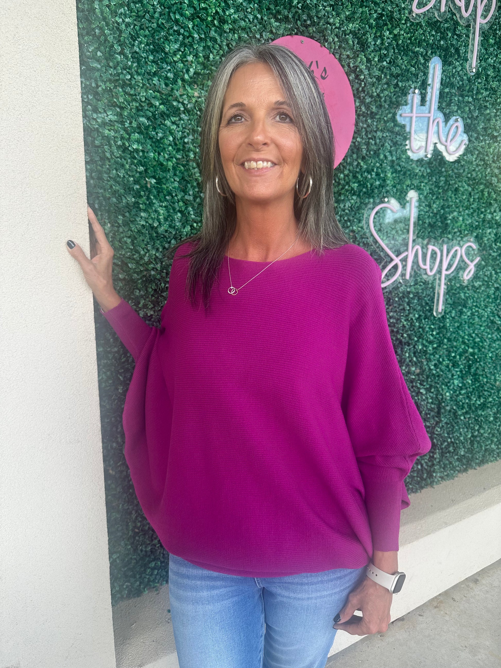 Wrap yourself in comfort and style with our Purple Butterfly Sweater! The dolman and long sleeves create a unique silhouette, while providing warmth and versatility. Stay on-trend and make a statement with this must-have piece in your wardrobe.