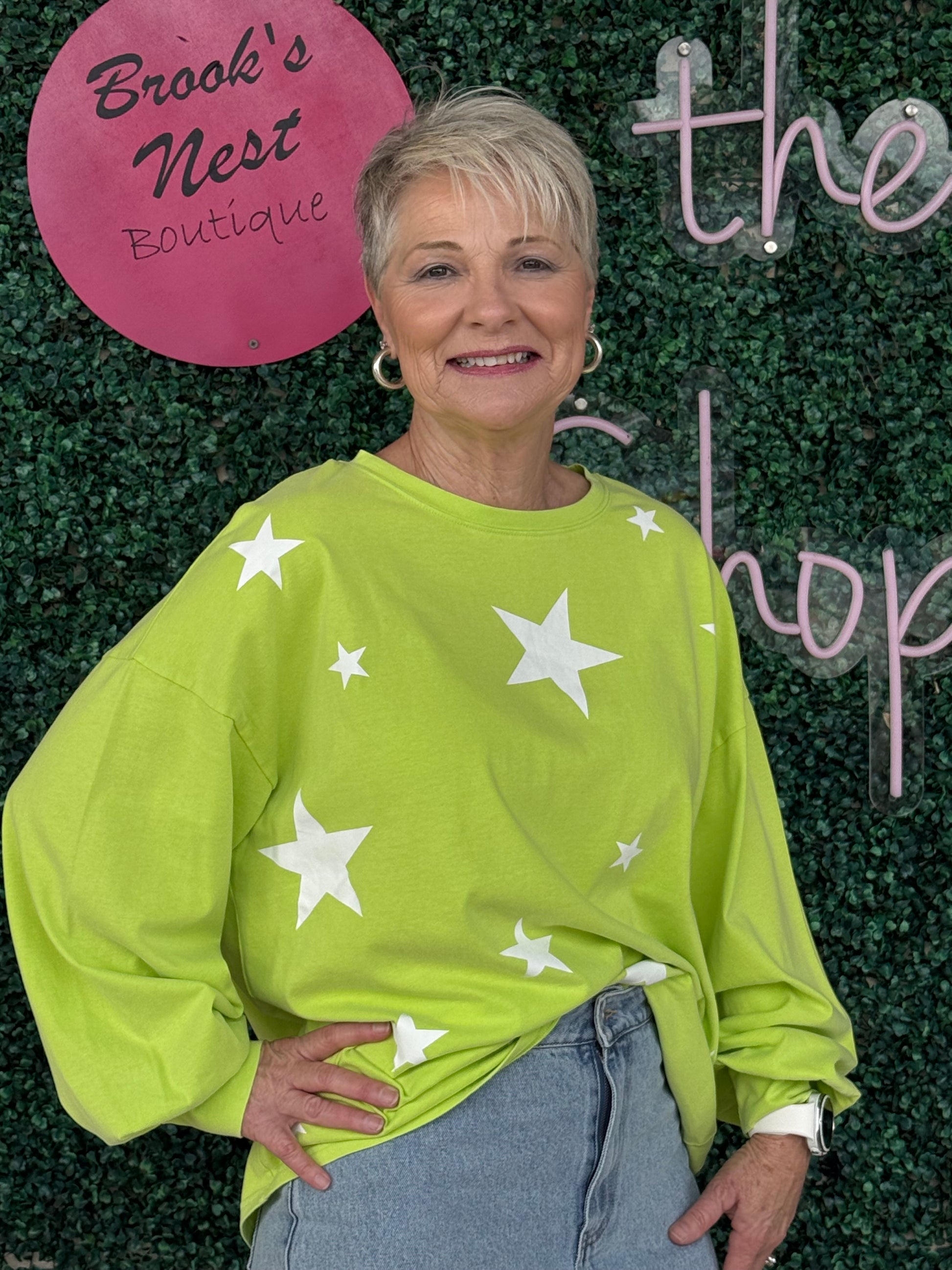 Add some shine to your wardrobe with our Starbright Top. Featuring long sleeves, a playful star print, and a trendy mineral wash, this top will keep you stylish and comfortable all day long. Elevate your look and stand out from the crowd with this must-have piece!